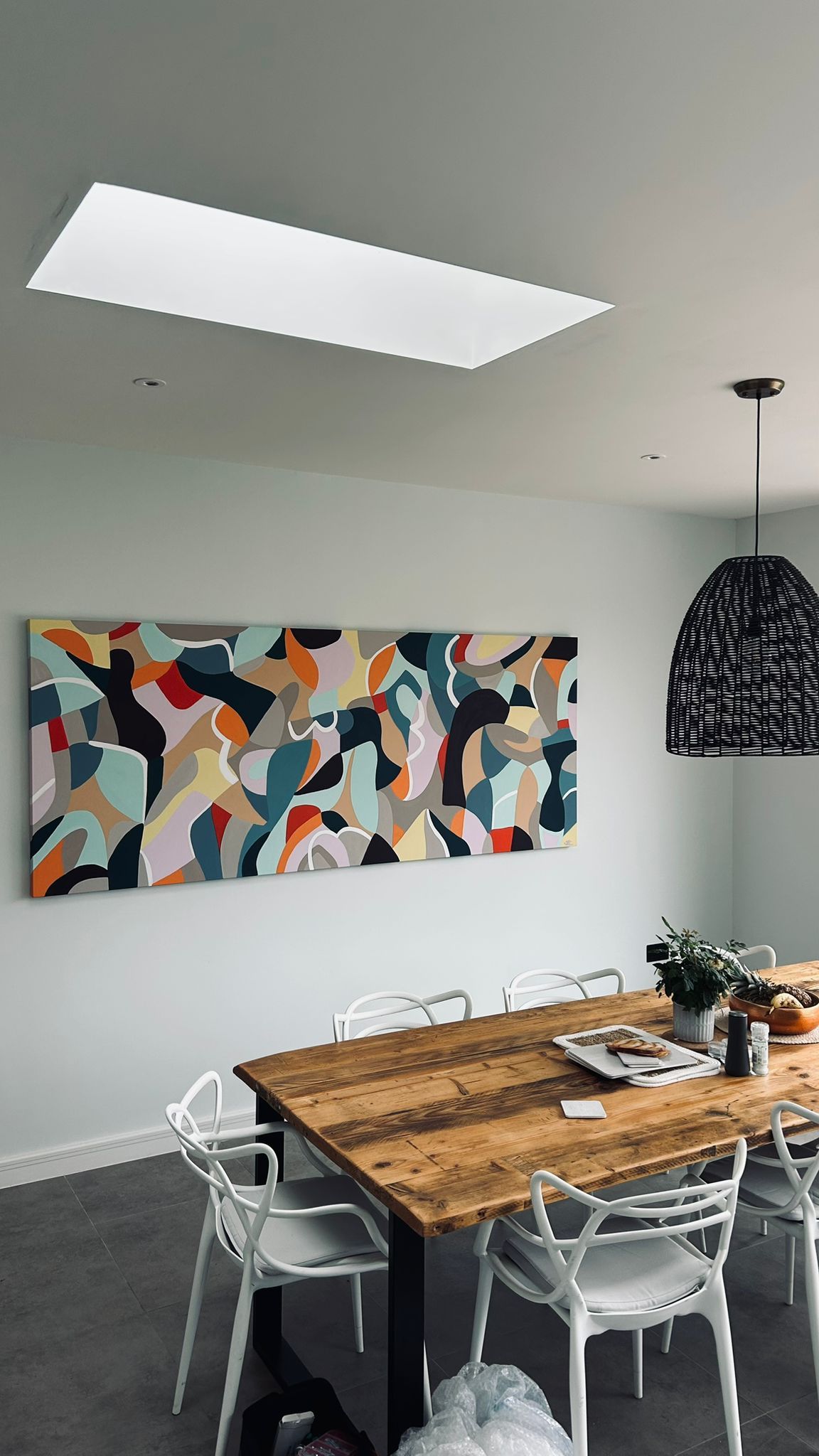 Installed a large abstract canvas in a dining area. The wall and lighting layout meant the piece needed to sit centred both horizontally on the wall and in relation to the dining table below. We took final measurements, marked the hang points, and used concealed fixings for a clean finish. Jan Erika was involved in the process.
