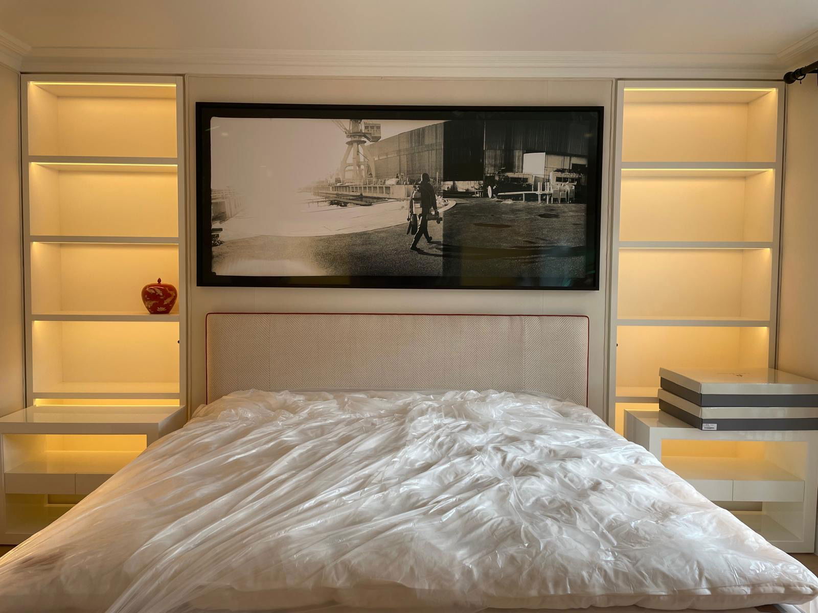 The bed, headboard, and surrounding furniture were fully protected while we prepared the space. Once the layout was set, we securely mounted the artwork with precision, making sure it was level and balanced. The soft integrated lighting around the shelves highlights the piece beautifully, creating a clean and elegant focal point for the room.