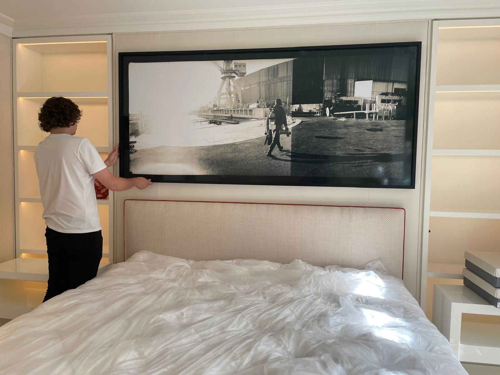 We were commissioned to install a striking black and white photographic piece in a beautiful Notting Hill home. Before starting, we carefully measured and marked the wall to ensure the artwork would sit perfectly centered above the bed and aligned with the bespoke shelving on either side.
